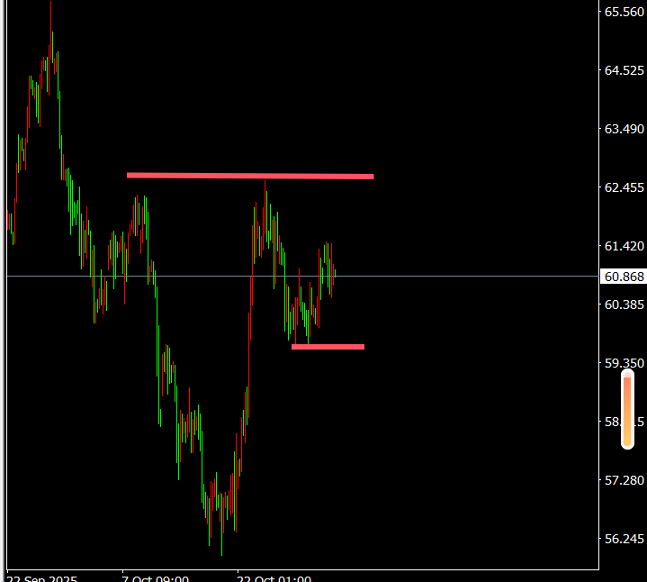 原油周一处于区间震荡,当天最高61.5,最低60.5,日线收阴于61,日线看油价还有反弹的势头,四小时线,小时线,均呈区间震荡,综述日内先看震荡的突破情况,下方关注60,上方看62