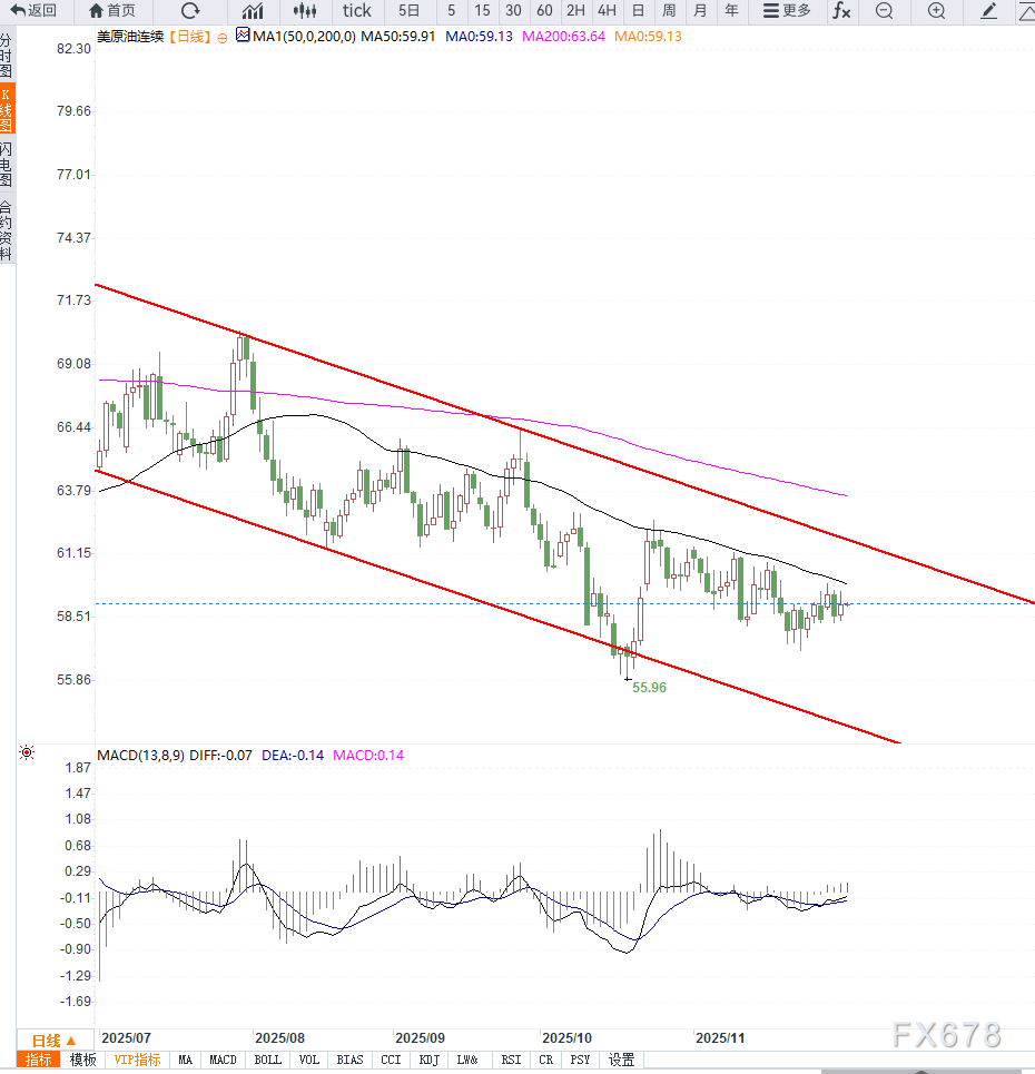 从日线级别走势来看,WTI 价格持续在 58—60 美元/桶区间震荡整理,显示多空力量短期内难分胜负。58 美元下方多次形成支撑,表明买盘意愿仍在;60 美元上方压力明显,构成阶段性强阻力。