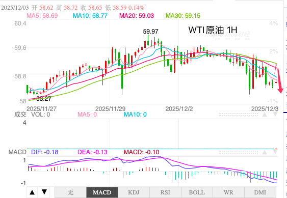 周二,美国西德克萨斯中质原油(WTI)交易价格约为每桶59.20美元,当日下跌0.20%。受美元走强影响,该商品价格持续承压,投资者正等待美国石油协会(API)当日晚些时候发布的每周库存报告。
